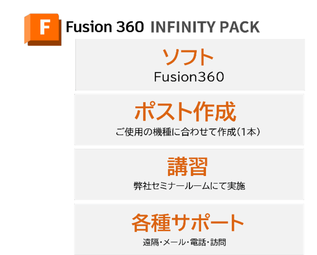 Fusion360 INFINITY PACK」にはソフト・講習・ポスト作成・サポートが含まれております。