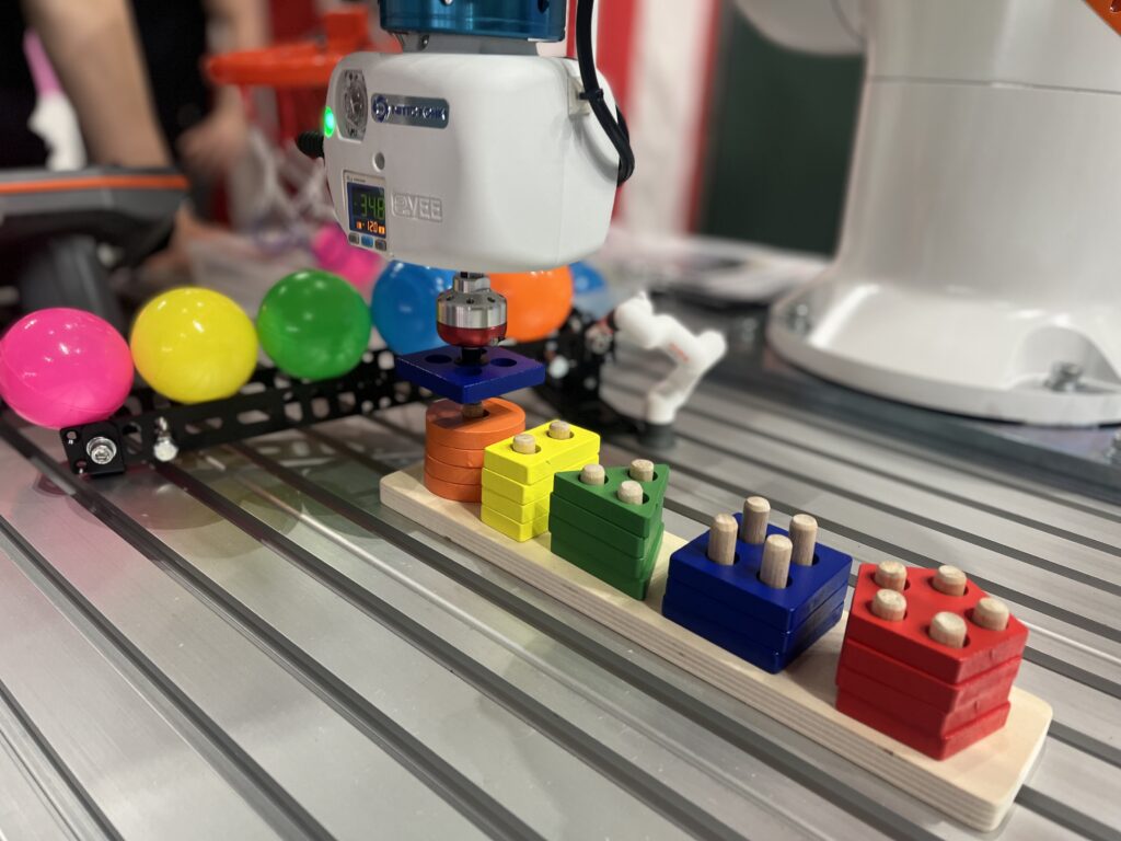 トルクセンサを活用し、ワークのあたり具合を感知して正しい場所にブロックをはめるデモンストレーションです。